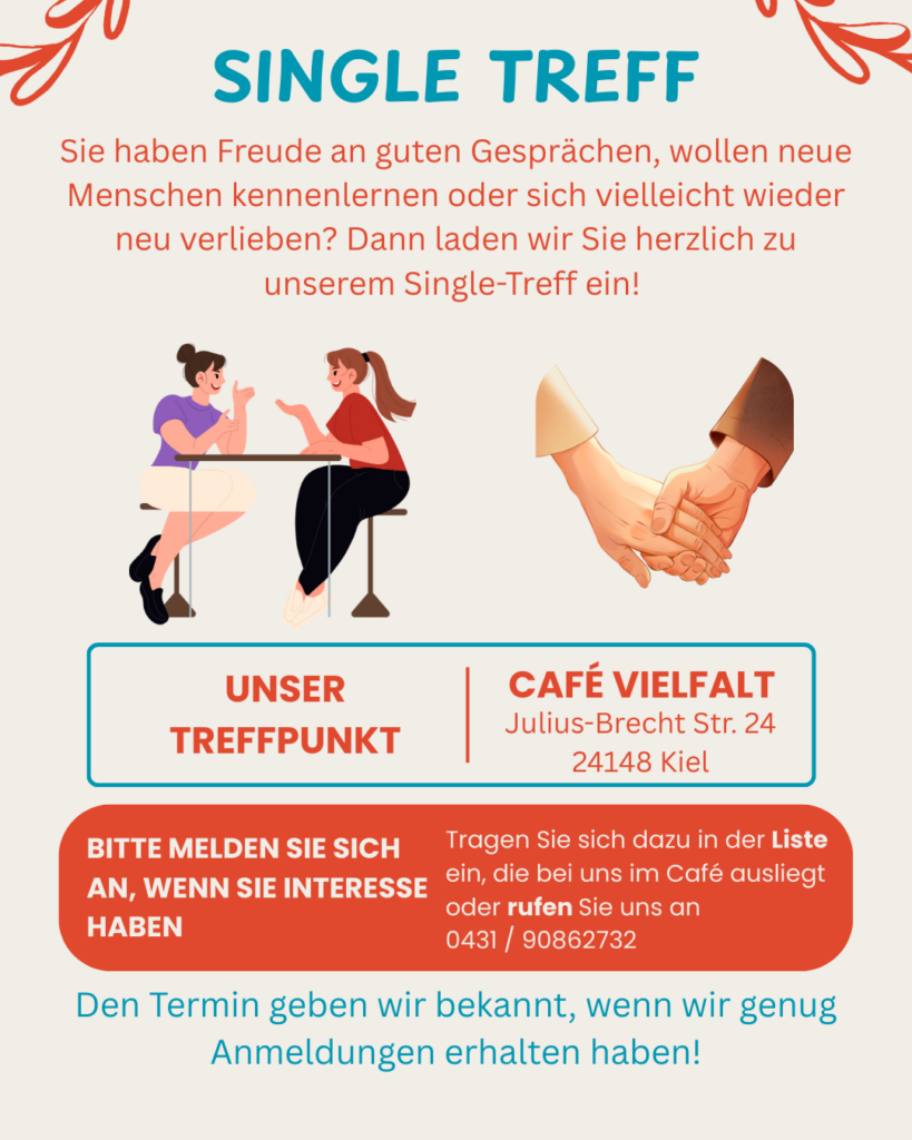 Wir planen, am Anfang des Jahres einen „Single Treff“ zu veranstalten. Alle weiteren Infos zum Veranstaltungstag finden Sie hier, sobald genug Anmeldungen eingegangen sind. Sehen Sie dazu gerne unseren Flyer: